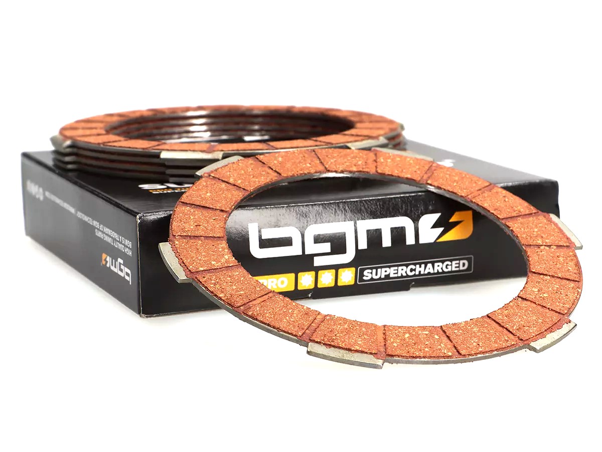 The bgm PRO Superstrong clutch friction plates in the Racing Red version belong to the most performant ffriction pplates on the market. The highly resilient organic clutch facing compound is made for the high pressures and high temperatures in racing. The high-quality friction material is thinner than a conventional cork ones. This allows the installation of an additional friction disc in the entire Racing Red pad package.