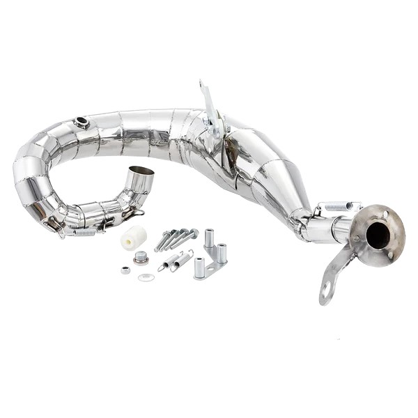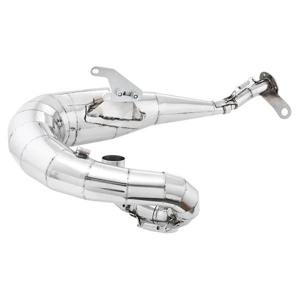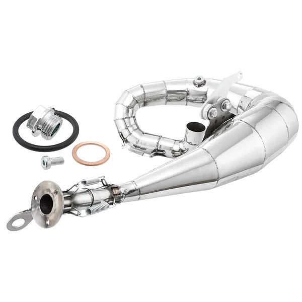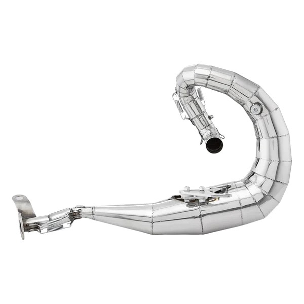 Where a four-stroke motor requires valves, camshaft, exhaust and a turbo, a two-stroke just requires a well designed exhaust. A few pieces of sheet-metal modelled to create a form that harmonises perfectly with the layout and size of the openings in the cylinders bore, known as transfer and exhaust ports. The design of the resonance chamber not only influences the removal of hot exhaust gases, but the pulse effect also affects the flow of fresh fuel mixture into the cylinder. On modern two-strokes this technology is the main reason for its superiority over the four-stroke motor.