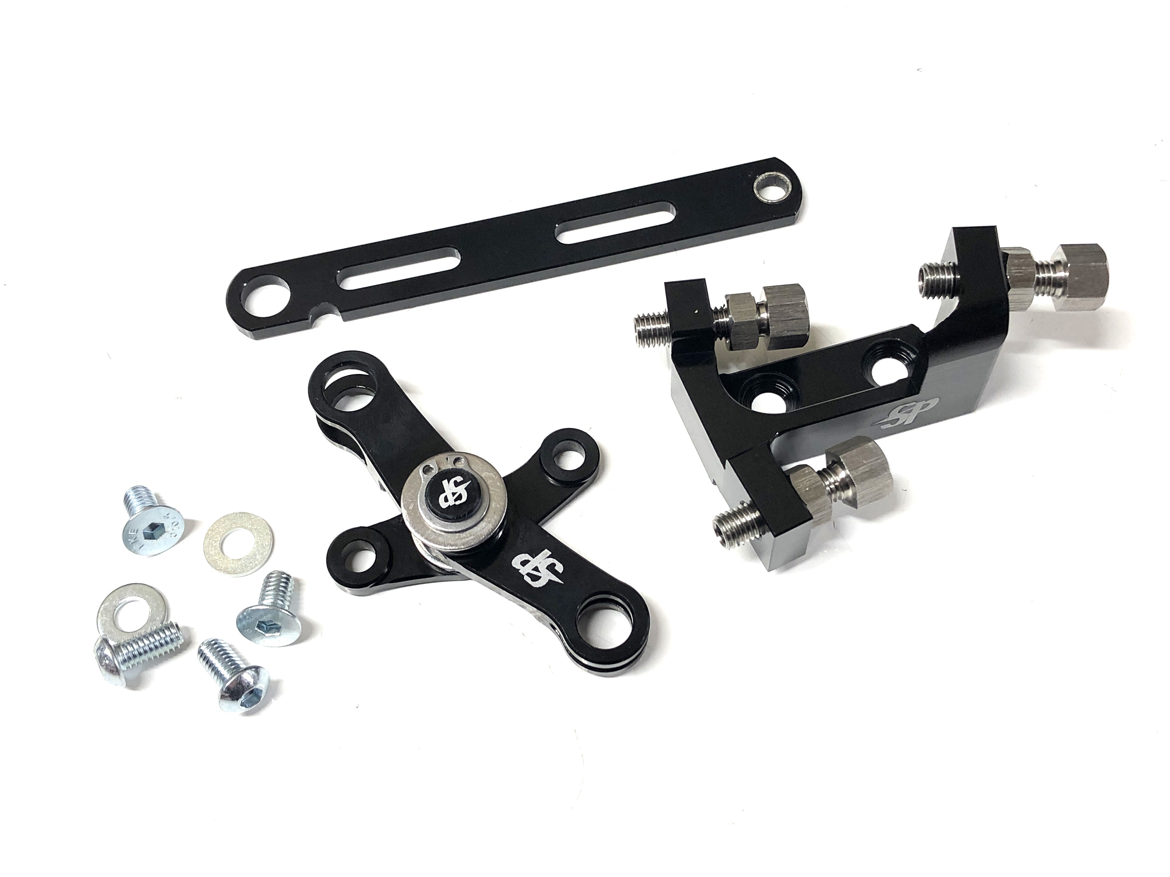 Gear linkage set in BLACK, Includes gear swivel, Adjuster block with stainless adjuster screws x 3, gear...