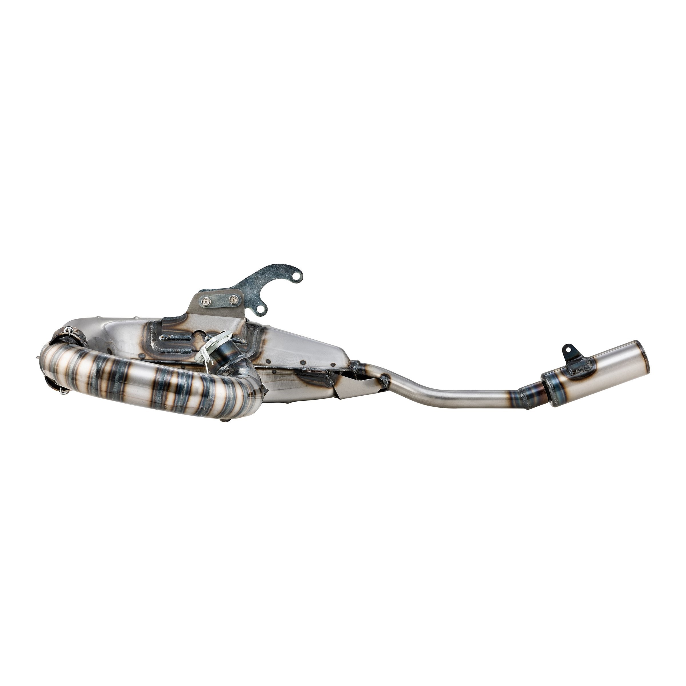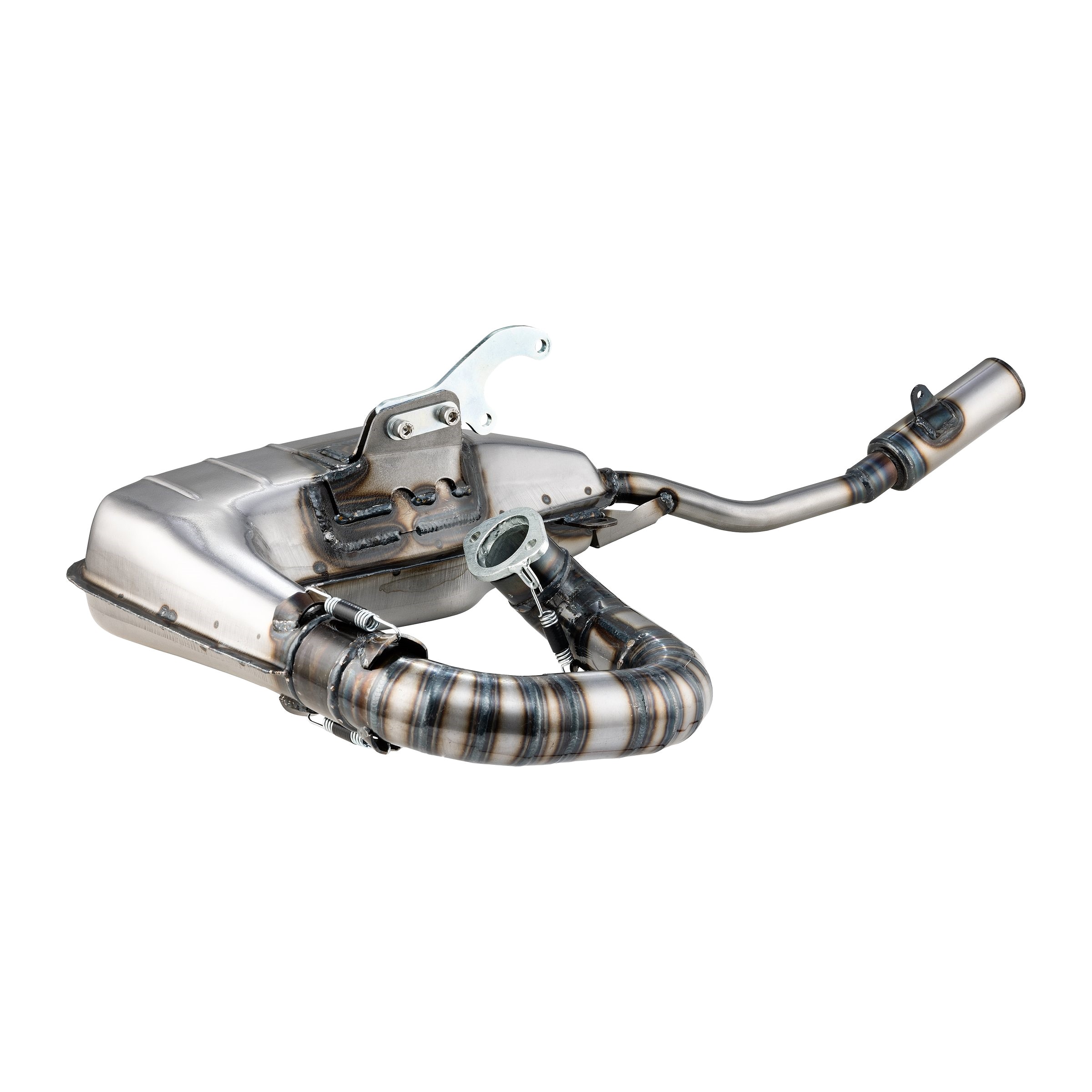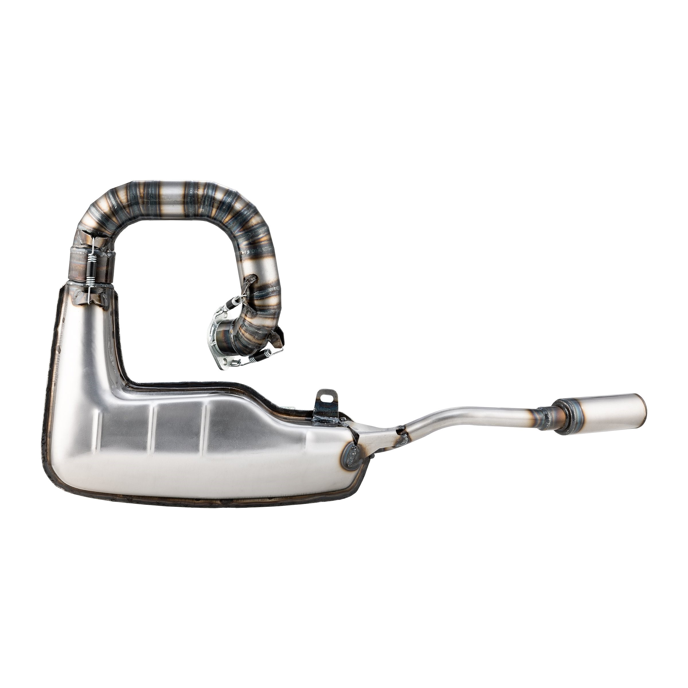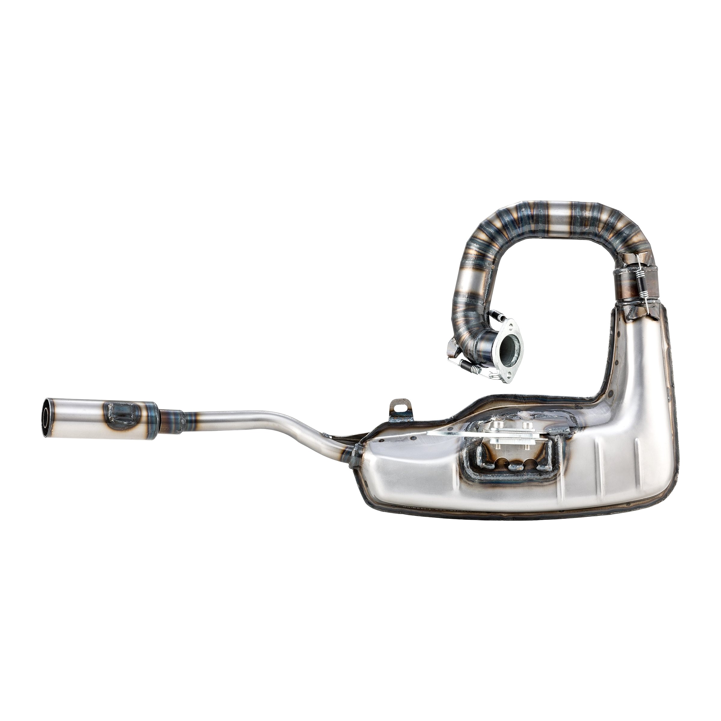 The 'Clubsport' box exhaust takes the concept of the common Clubman system to the next level. Although the performance delivery as just as reassuring, torquey and as harmonic as the original they can facilitate a peak power value similar to those produced by full-blown racing expansion chamber exhausts. The Clubsport harmonises well with set ups road tuned for everyday use, so extreme port timings and piston-ported cylinder layouts should be avoided. Despite this, a relaxed commute and cool urban cruising can also be achieved when it is combined with a cylinder such as the Monza or TS1. Alongside all this, the designers of the Clubsport also did their homework when it comes to exact production dimensions and fitting. Their exhaust is precisely constructed and is very easy to mount, without any mechanical stress points. The individually welded segments of the visible manifold also ensure a decent sporting appearance.