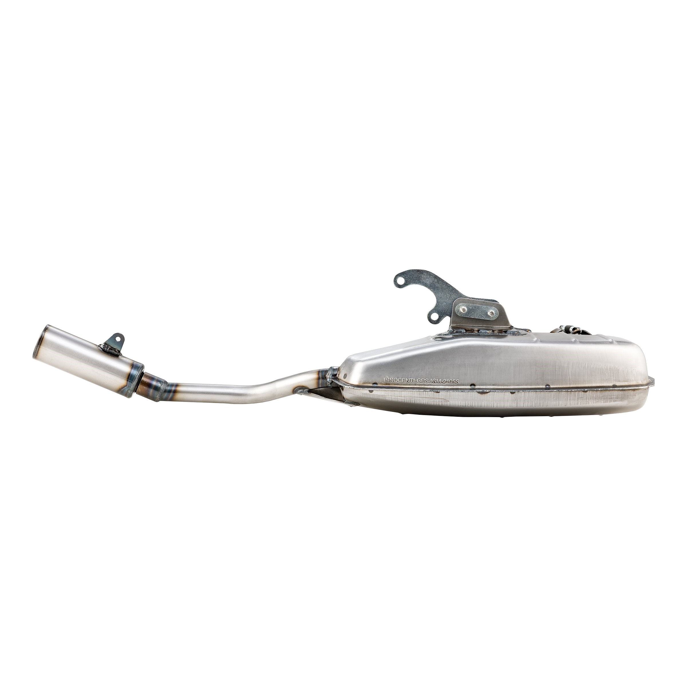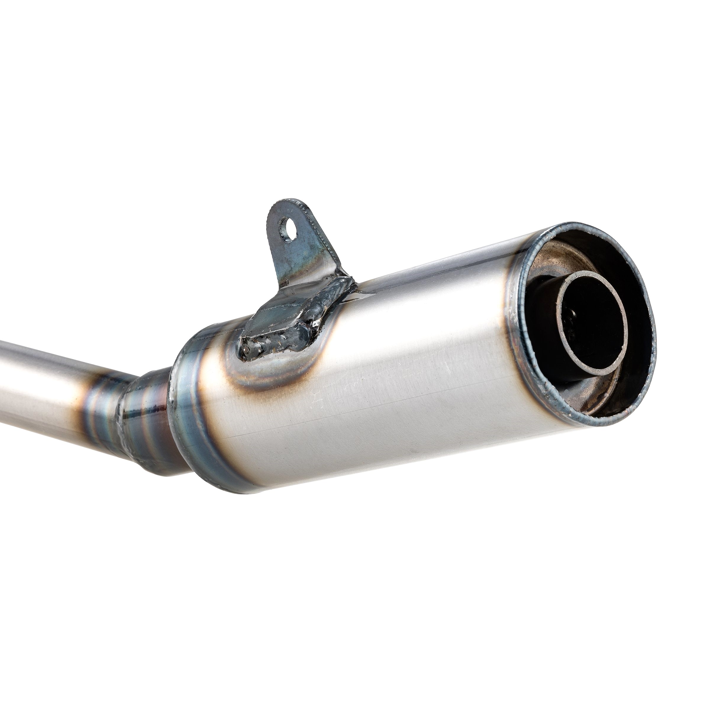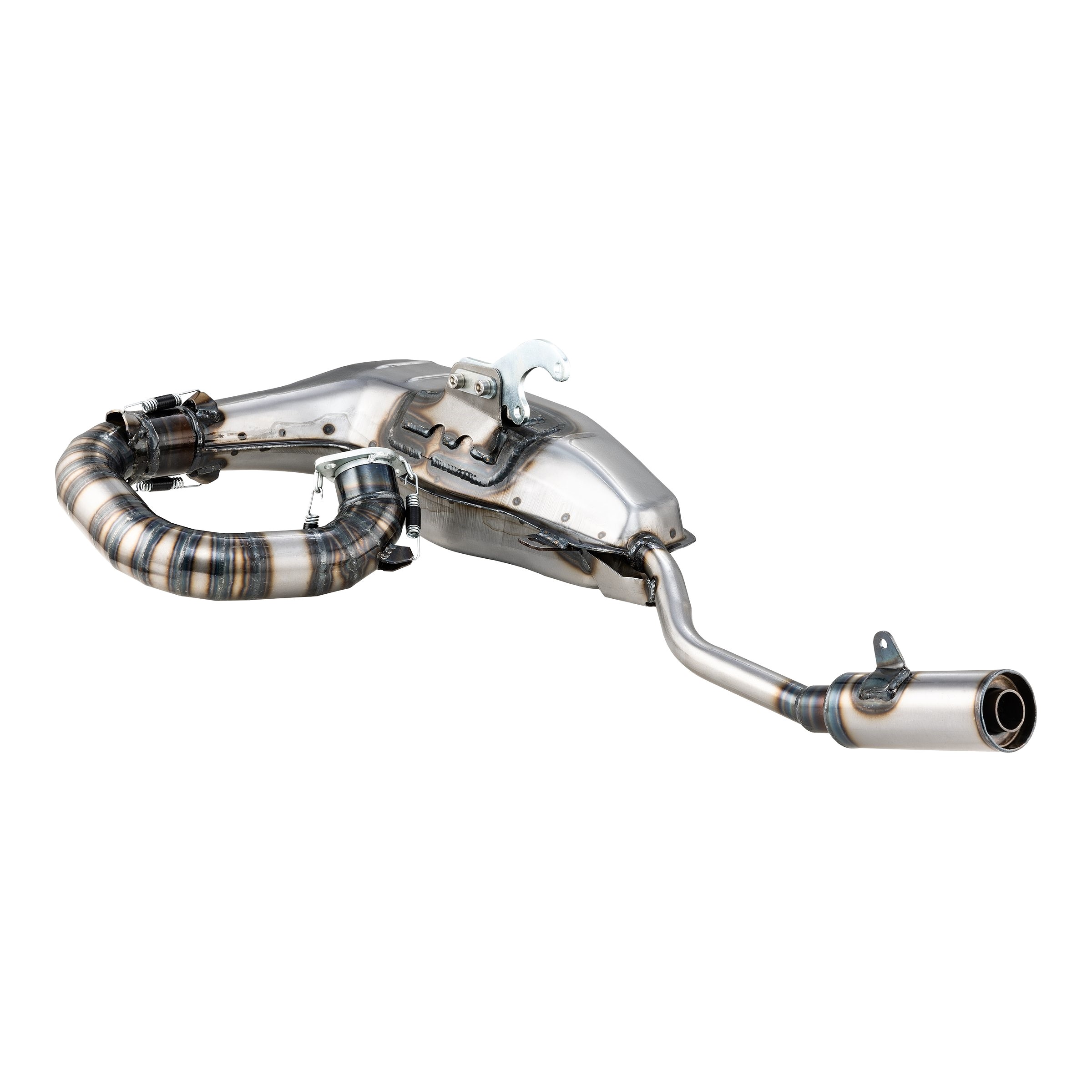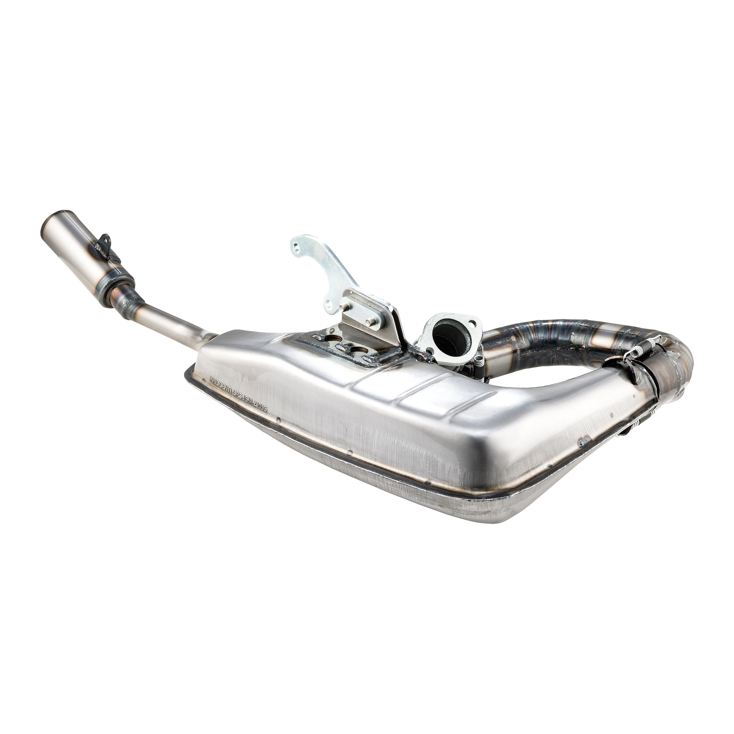 The 'Clubsport' box exhaust takes the concept of the common Clubman system to the next level. Although the performance delivery as just as reassuring, torquey and as harmonic as the original they can facilitate a peak power value similar to those produced by full-blown racing expansion chamber exhausts. The Clubsport harmonises well with set ups road tuned for everyday use, so extreme port timings and piston-ported cylinder layouts should be avoided. Despite this, a relaxed commute and cool urban cruising can also be achieved when it is combined with a cylinder such as the Monza or TS1. Alongside all this, the designers of the Clubsport also did their homework when it comes to exact production dimensions and fitting. Their exhaust is precisely constructed and is very easy to mount, without any mechanical stress points. The individually welded segments of the visible manifold also ensure a decent sporting appearance.