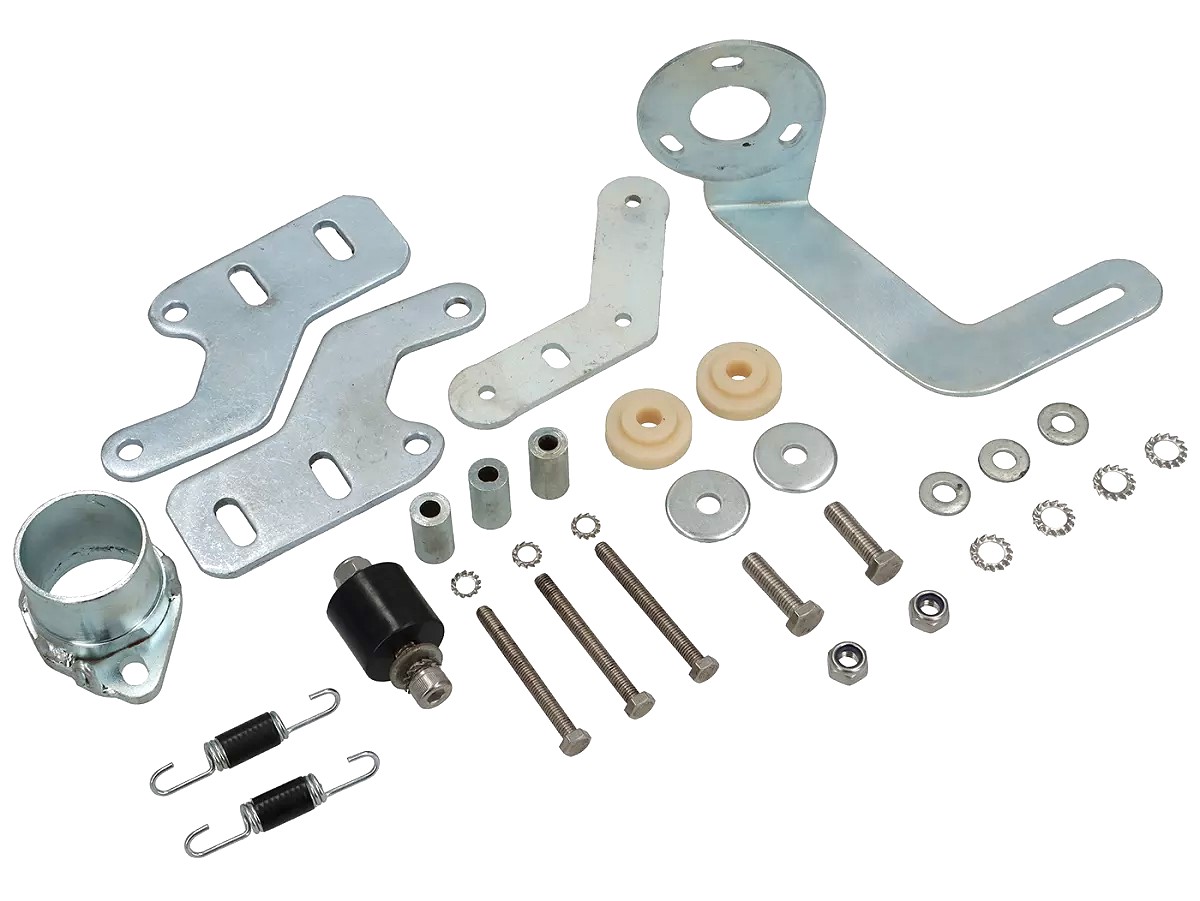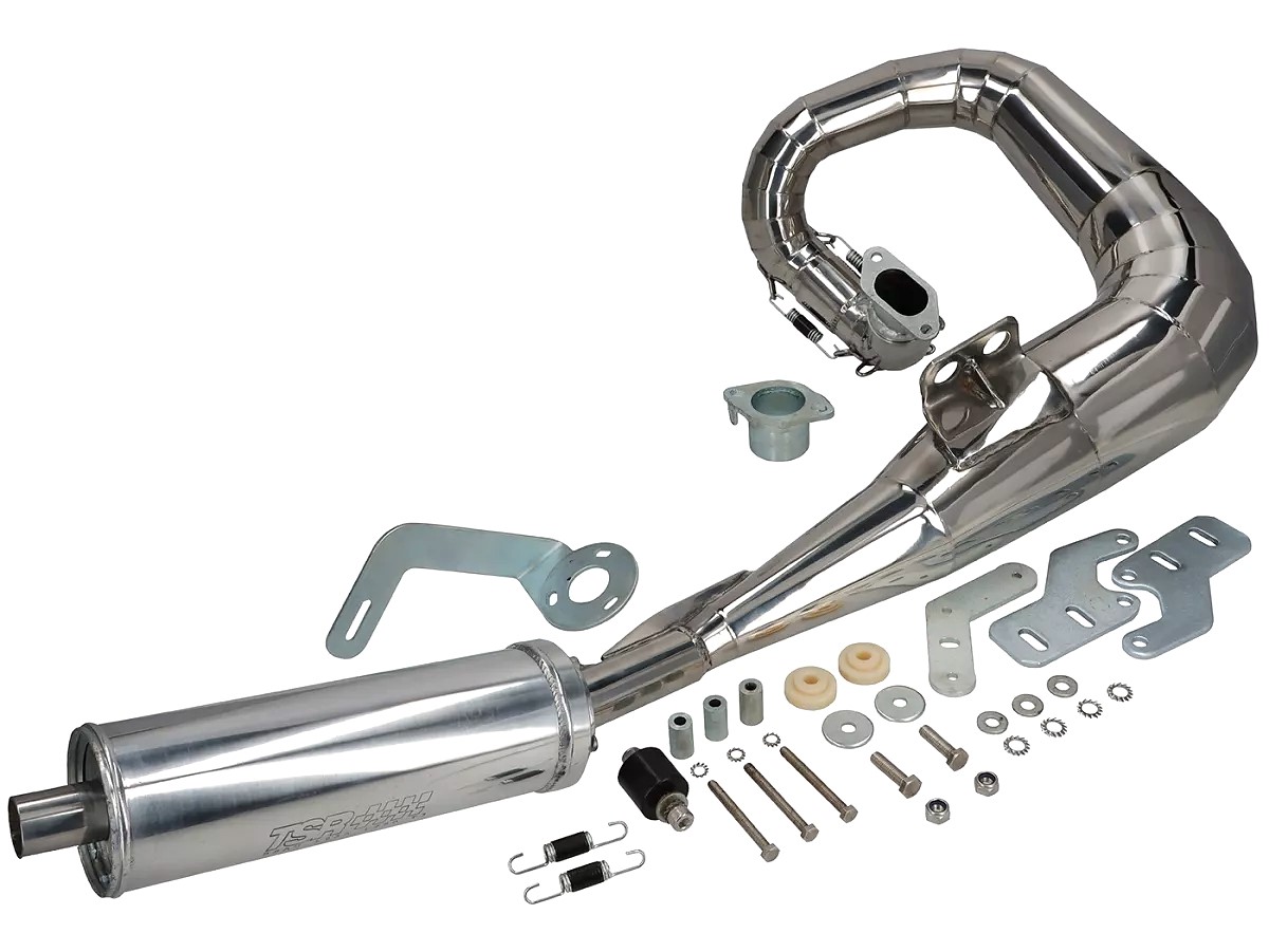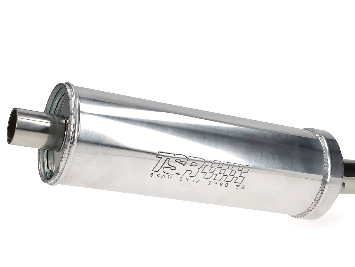 The exhaust works on all cylinders with a round outlet (TS1, SS 200, SS 225, Monza, Imola etc.) as well as on those with an oval outlet (RT, Casa, GT, Mugello etc.). Both flanges are included with this. The exhaust has two plug-in connections on the manifold for stress-free installation. The bracket for supporting the rear silencer is included. The silencer can be opened via a large circlip in order to re-pack it. In addition to the TSR logo, there is also a BSAU number on the silencer.