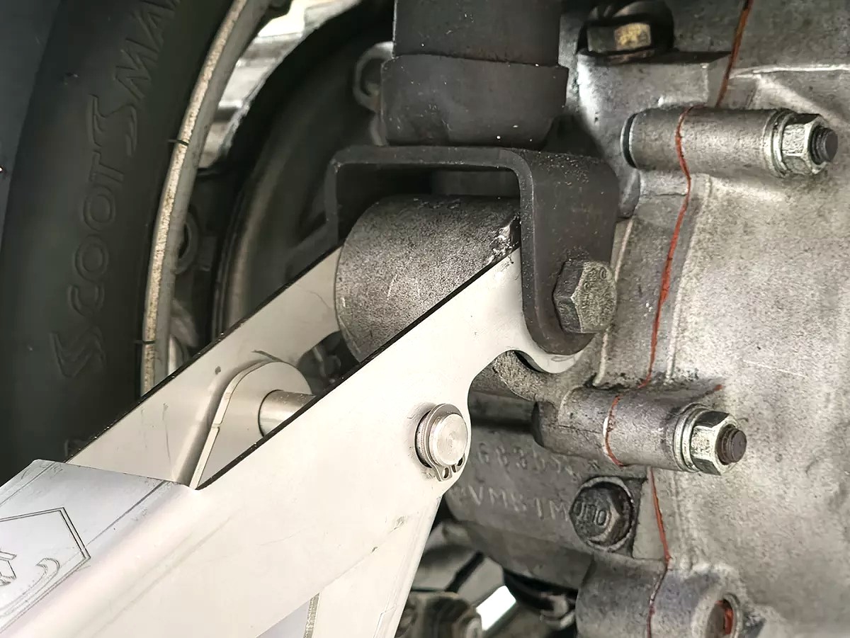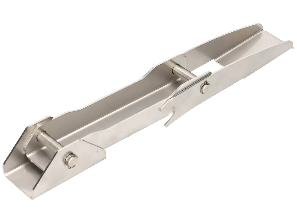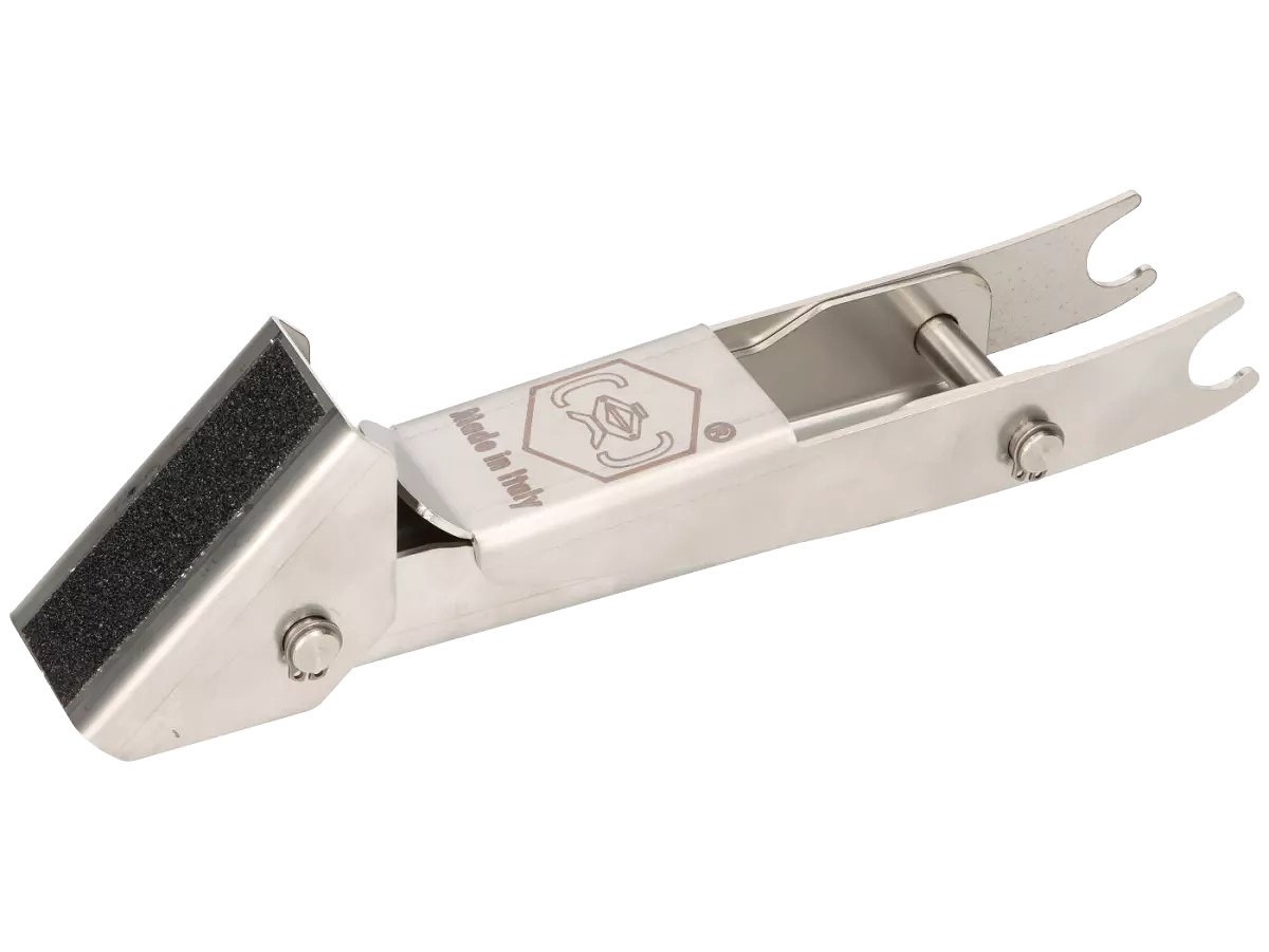 Jack/stand for Largeframe Vespa models such as PX, Rally, Sprint, GTR, VBB and similar. Is attached to the rear shock absorber bottom mount and folded up, then the rear wheel stands approx. 4 cm freely rotating in the air and can be easily removed. Ideal for traveling, fits in the luggage compartment, and very durable due to its stainless steel construction.