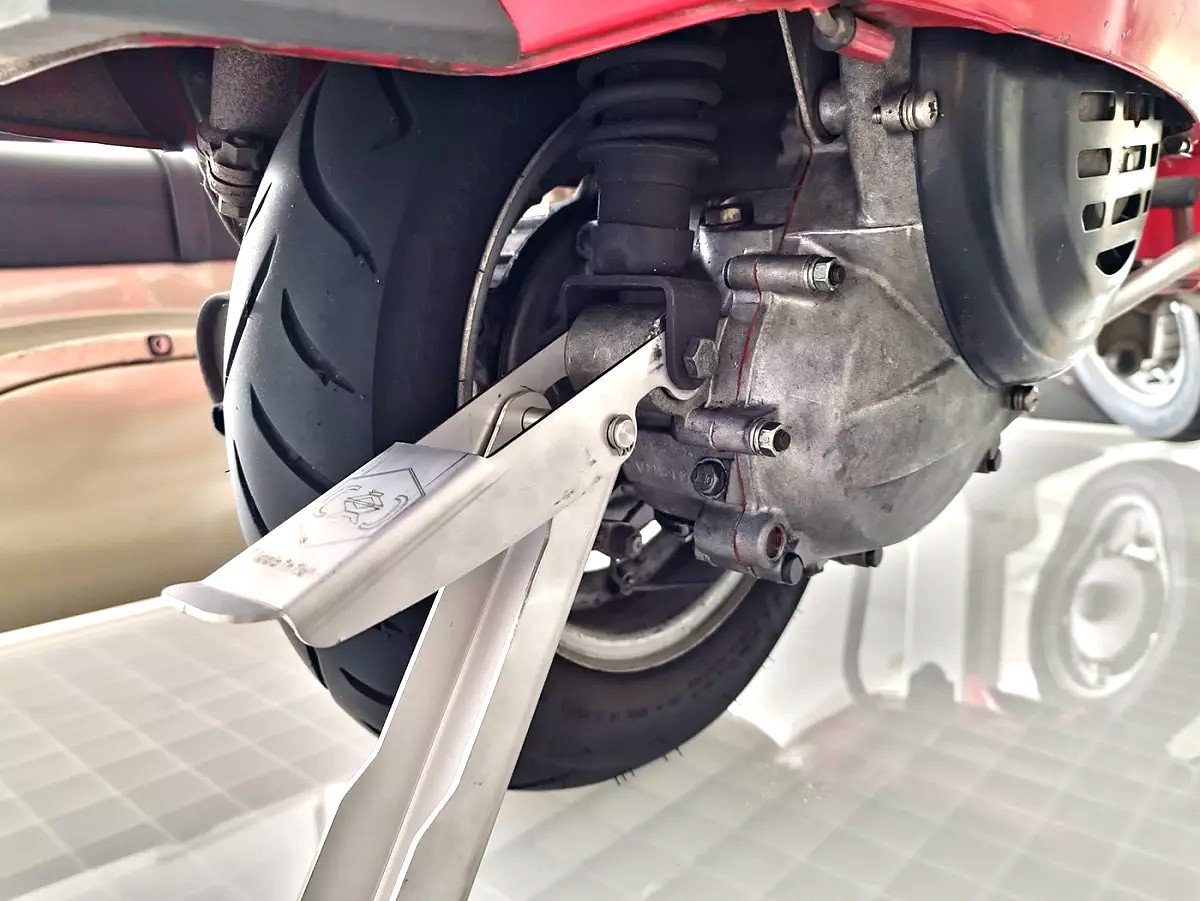 Jack/stand for Largeframe Vespa models such as PX, Rally, Sprint, GTR, VBB and similar. Is attached to...